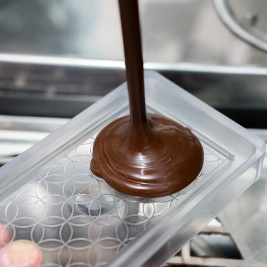 The tempered liquid chocolate is then poured into the mould. All our chocolate bars are handcrafted into the mould by hands. After cool down, the chocolate bar will be released from the mould. Last step, the chocolate bar will be sealed and packed carefully.