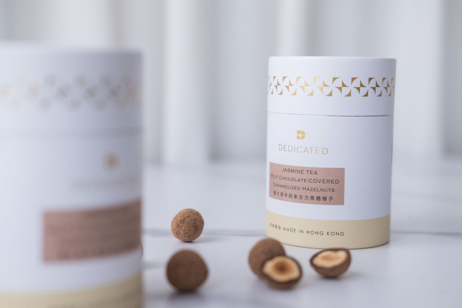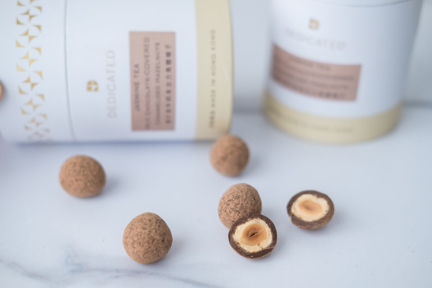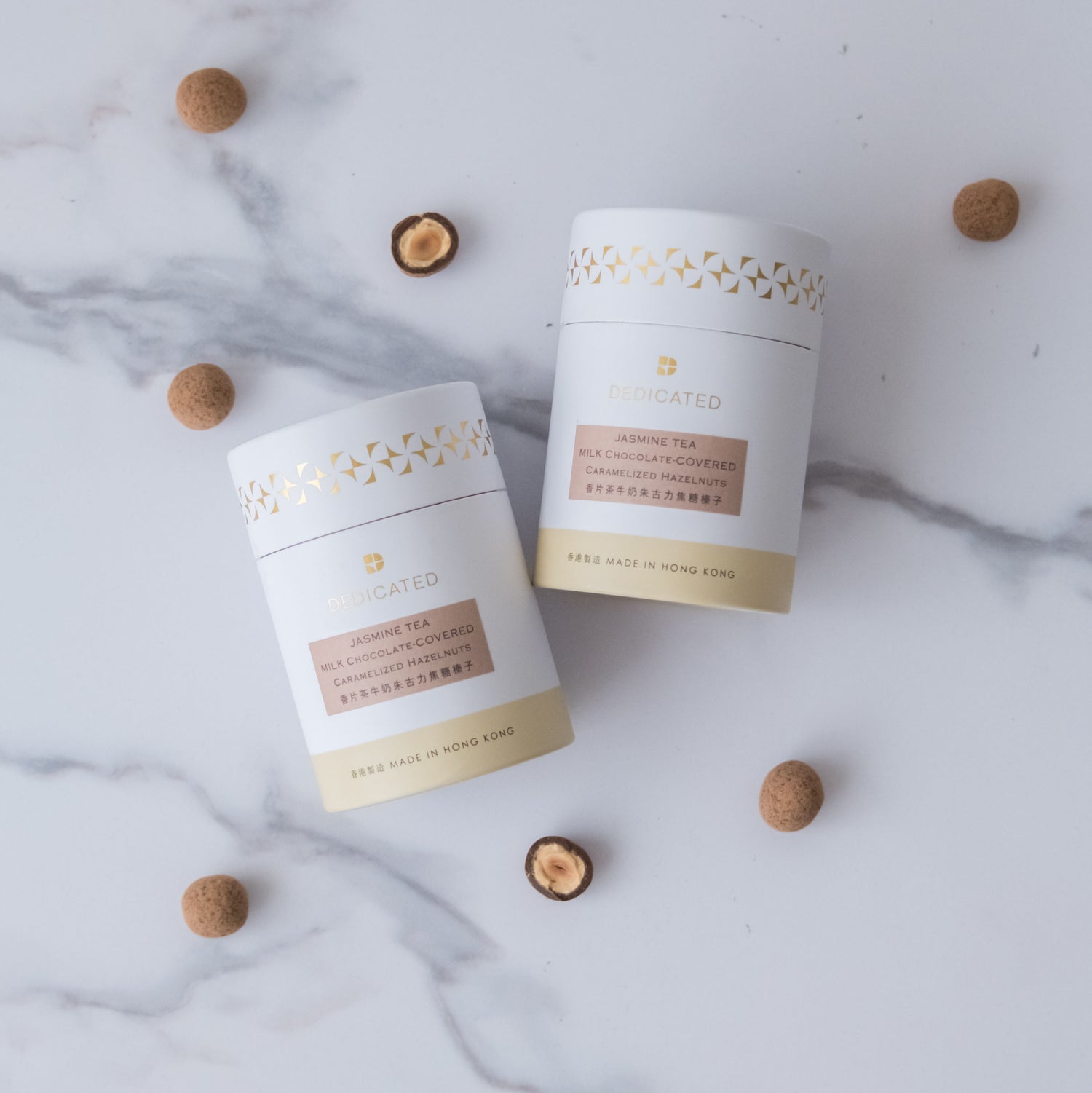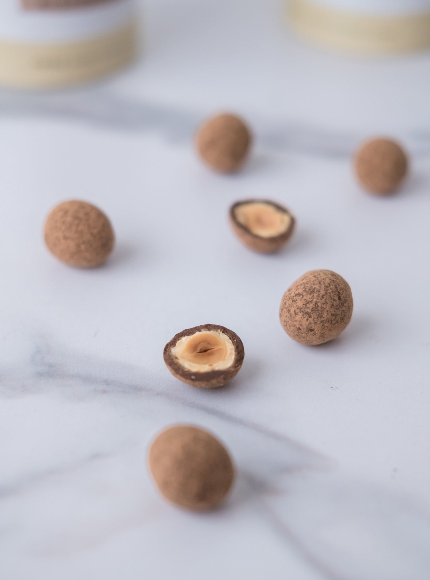 The high quality hazelnuts are first coated with caramelized sugar to makes it sweet and crunchy. We then coated the caramelized hazelnuts with jasmine tea milk chocolate. The chocolate covered hazelnuts are finally dusted with our organic single origin Peru natural cocoa powder.