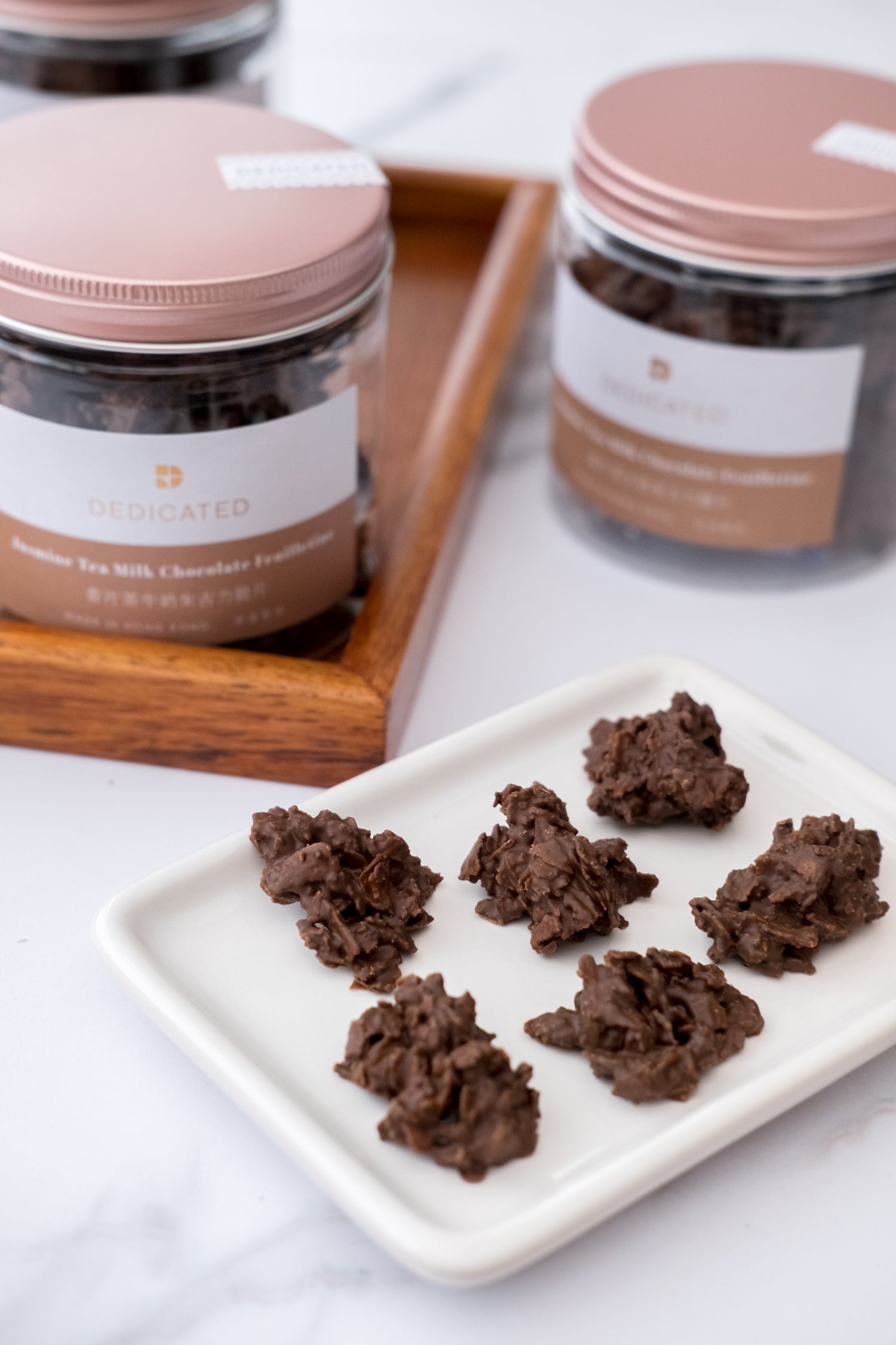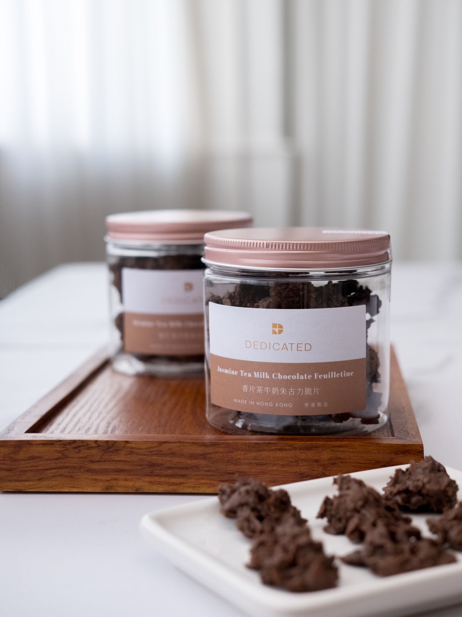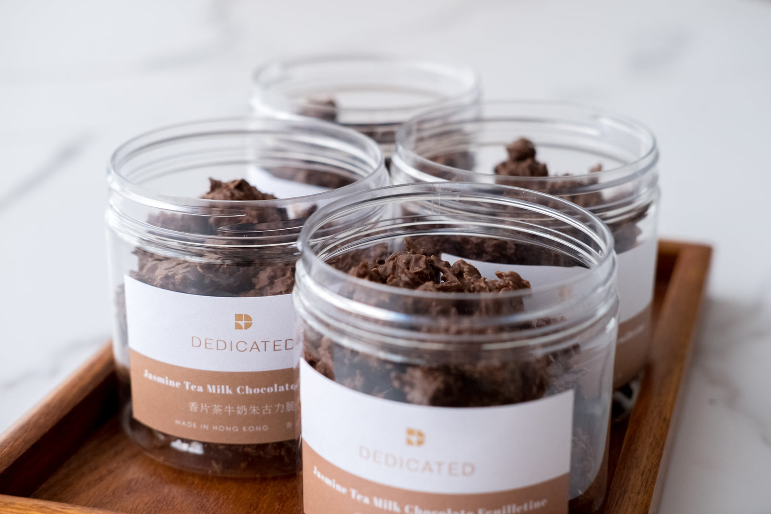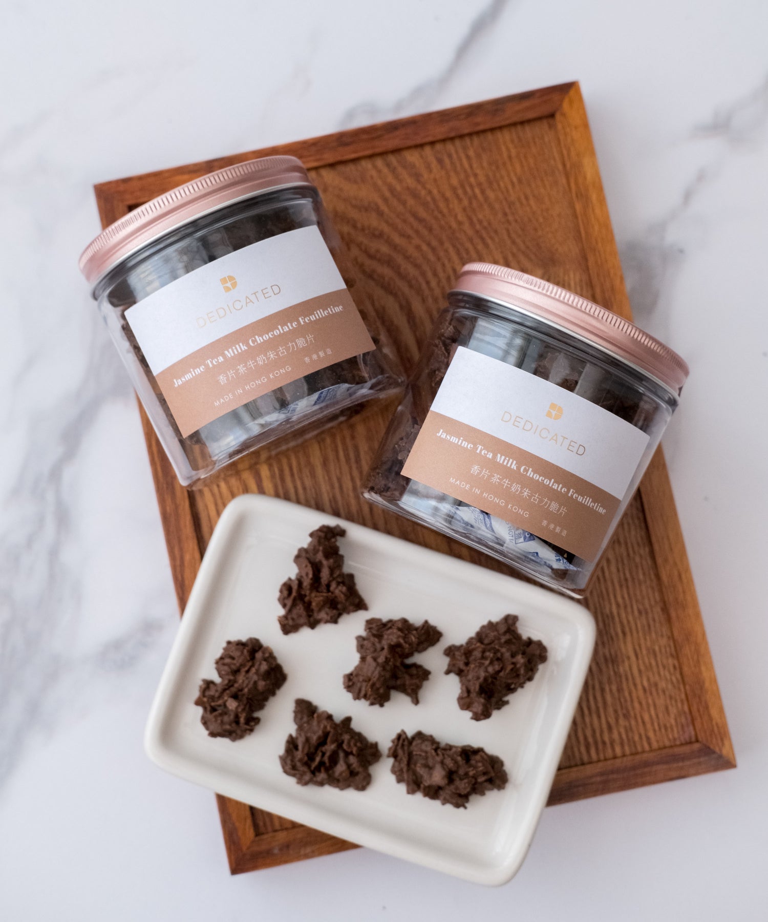 French feuilletine is a delicious and crispy wafer that break into small pieces, then mixed with our signature handmade 48% Jasmine Tea Milk Chocolate.