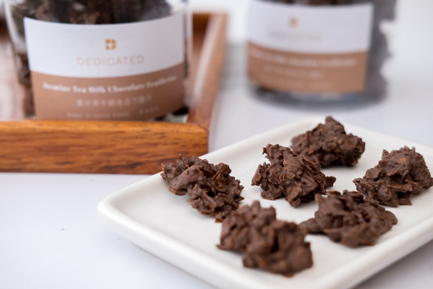Jasmine Tea Milk Chocolate (Cocoa beans, milk powder, cocoa butter, cane sugar, jasmine tea), feuilletine