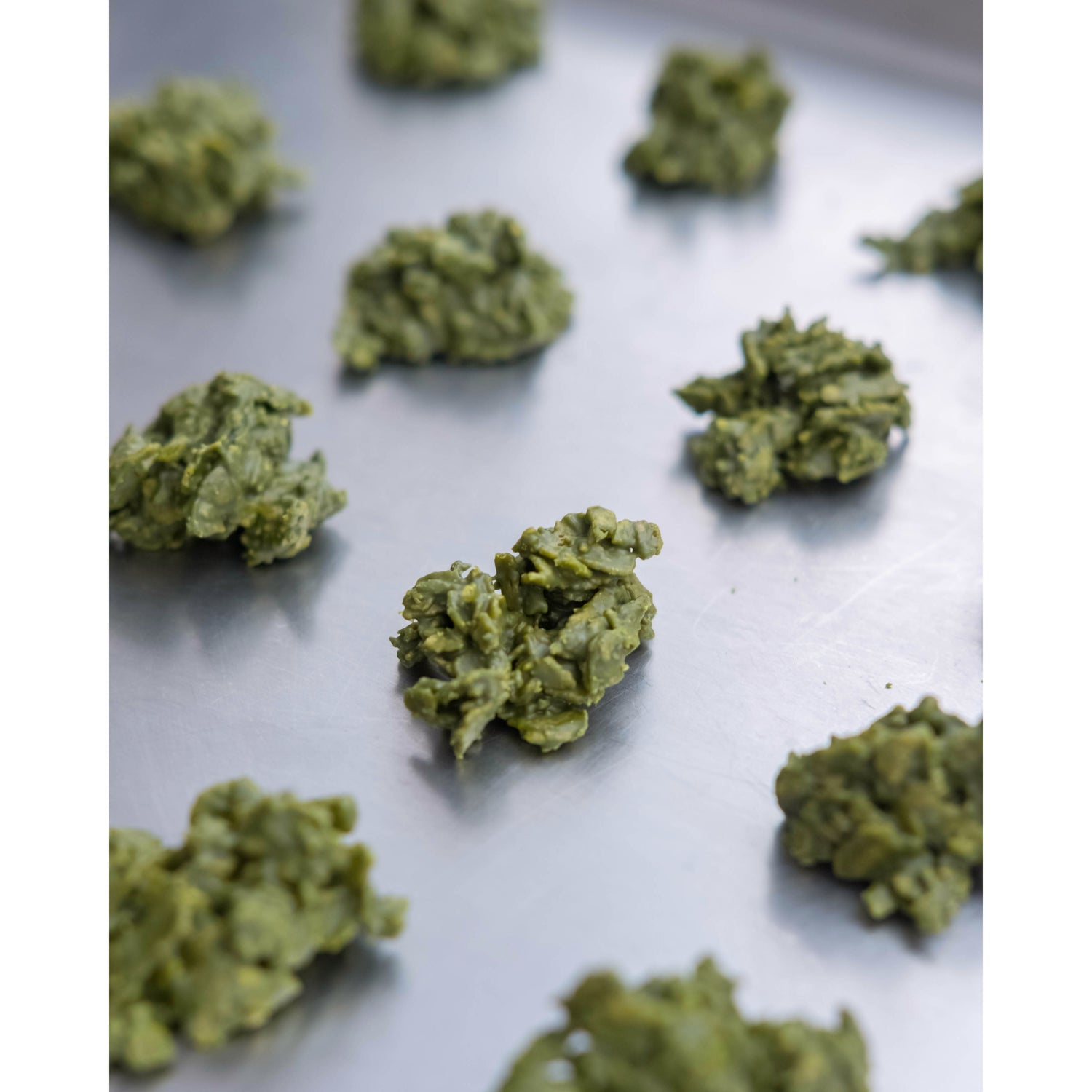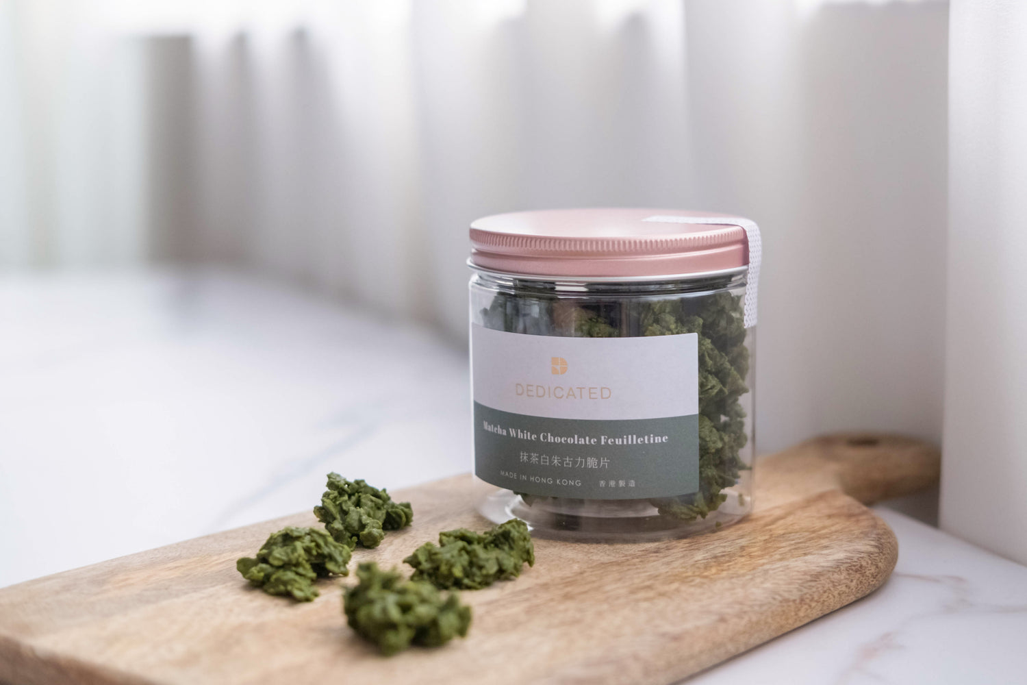 Matcha white chocolate (Cocoa butter, cane sugar, milk powder, matcha), feuilletine